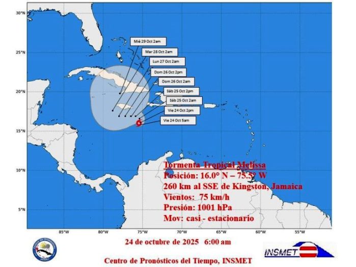 Durante el fin de semana la tormenta tropical Melissa seguirá con un movimiento lento acercándose a Jamaica y los mares al sur de Cuba. Se prevé un fortalecimiento gradual, seguido de una rápida intensificación.