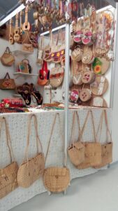 “I’ve participated in several editions of FIART, in 2015 and 2019, and now I’m back with my specialty, which is working with seeds and fiber. My forte is making bags from fiber—banana, jute—with braids made from malangueta or yagua palm. Everything is hand-sewn; nothing is glued. The embellishments are also sewn on,” says María del Rosario García.