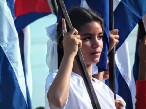 Nemesia se acerca a la ofrenda floral y corrige la posición de la cinta. Le acompañan dos pioneros que caminan junto a ella hasta el asiento que ocupará durante la celebración del acto conmemorativo por la victoria de Playa Girón.