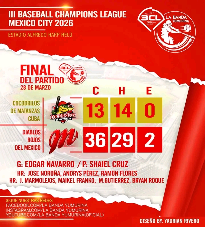 Los Diablos Rojos de México vapulearon a los Cocodrilos de Matanzas en el desafío del adiós de la Baseball Champions League Américas con pizarra de 36 anotaciones por 13.