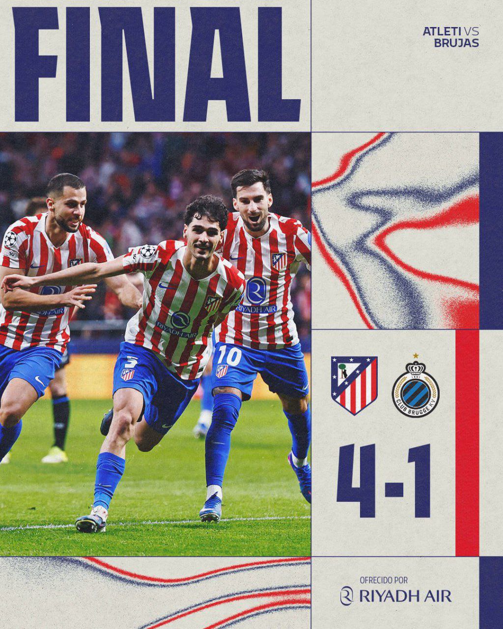 El Atlético de Madrid respondió con autoridad en el estadio Metropolitano. El conjunto rojiblanco goleó 4-1 al Club Brugge KV en el partido de vuelta de los play offs de la UEFA Champions League y certificó su avance a cuartos de final con un global de 7-4.