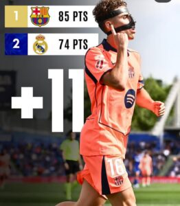 El club de la ciudad condal encabeza la tabla de posiciones con saldo de 85 unidades, once más que el Real Madrid, que marcha segundo con 74, y el podio lo completa el Villarreal con 62 puntos.
