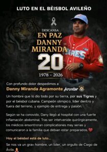 El béisbol cubano y, en especial, el de la provincia de Ciego de Ávila amanecen de luto tras el fallecimiento de manera repentina del mentor de los Tigres de Ciego de Ávila, Danny Miranda Agramonte.